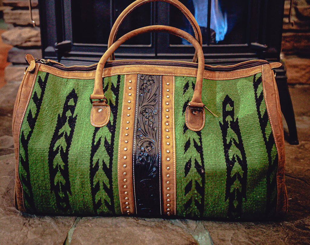 Built from premium full-grain black leather and authentic New Zealand wool, this duffel showcases an olive green saddle blanket inlay with a striking Arrowhead black pattern — a look that’s rich, refined, and undeniably western. Every inch of the leather is hand-carved and tooled by skilled artisans, bordered with silver stud details that add just the right amount of shine.