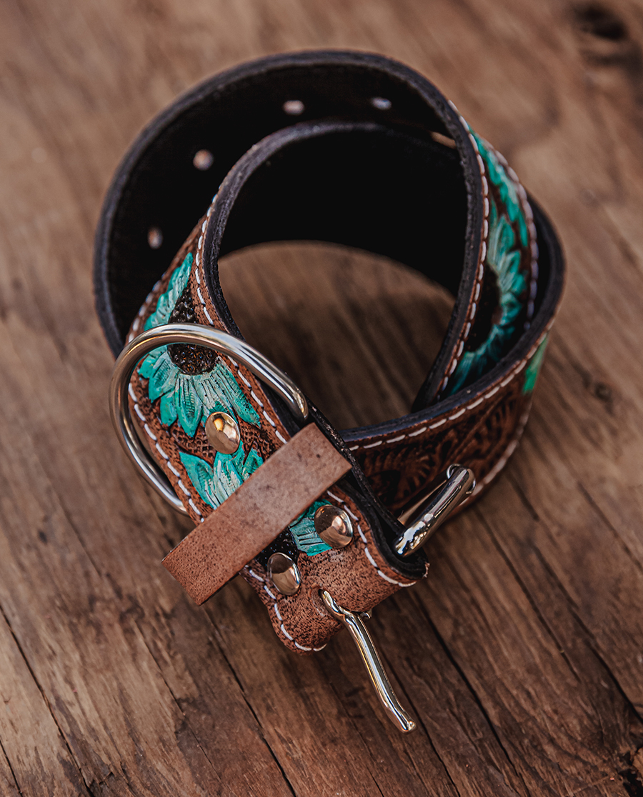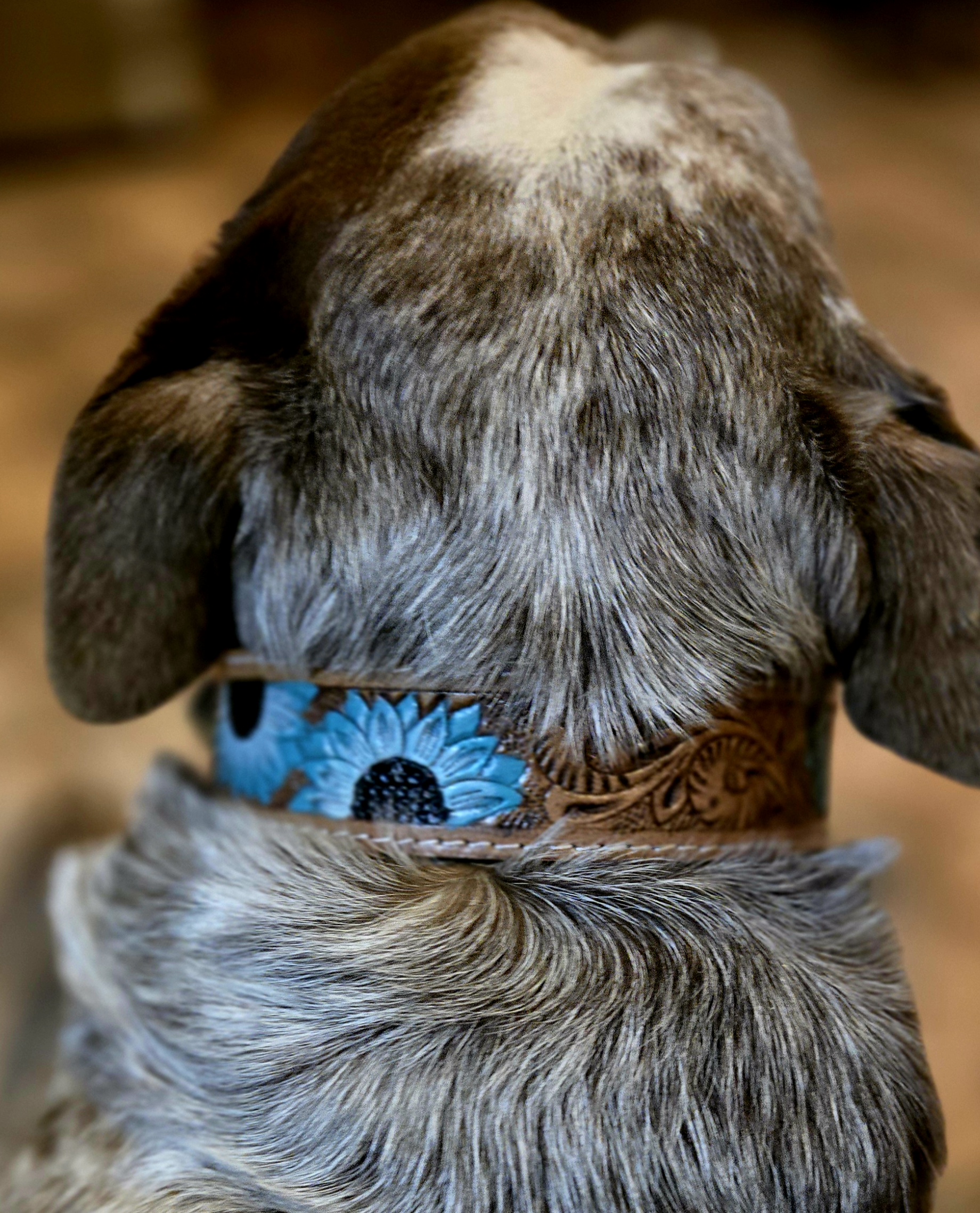 Hand-painted western leather dog collar featuring dainty blue floral details. Crafted from full-grain leather with a soft padded liner and stainless steel hardware. Vintage-inspired, handmade, and built for strong, beautiful dogs that carry a little cowgirl class with every step.