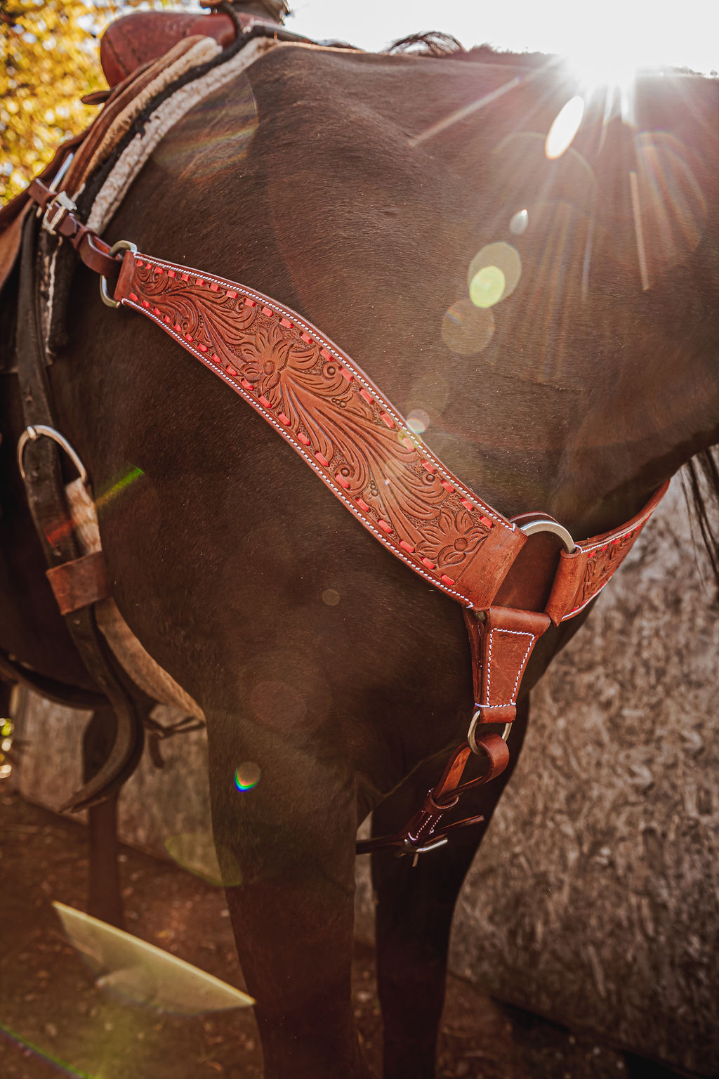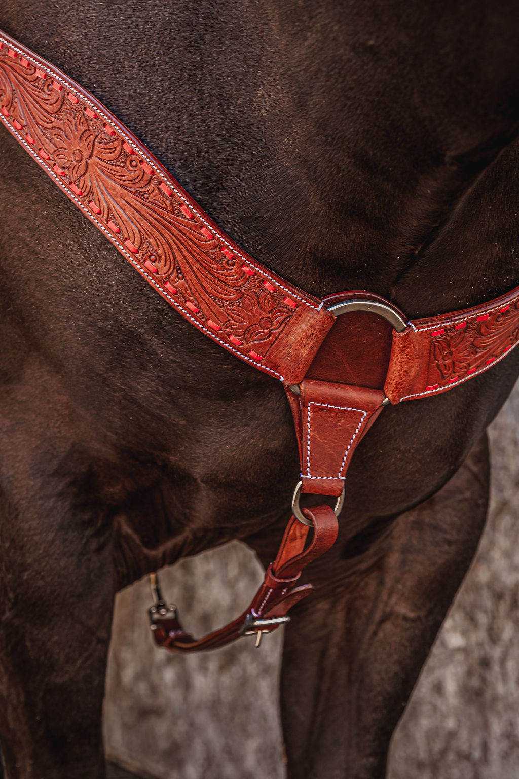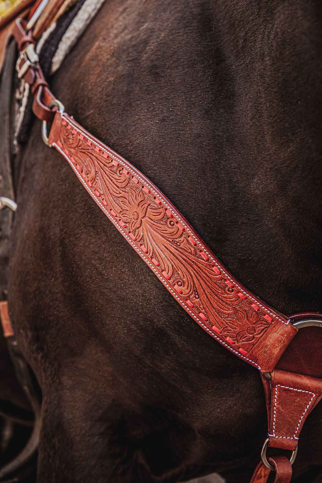 This breast collar is a real head-turner with its striking red rawhide buckstitching and exquisite floral tooling, each detail meticulously hand-carved into rich harness leather. It’s crafted not just to catch the eye but to offer lasting performance and comfort. The design strikes the perfect balance, making a bold statement while maintaining an air of understated elegance.
