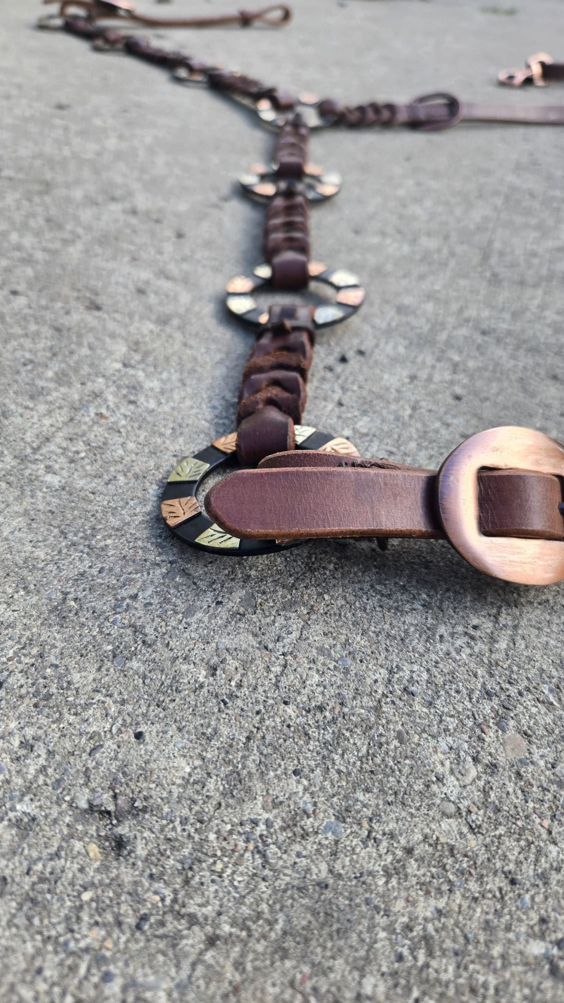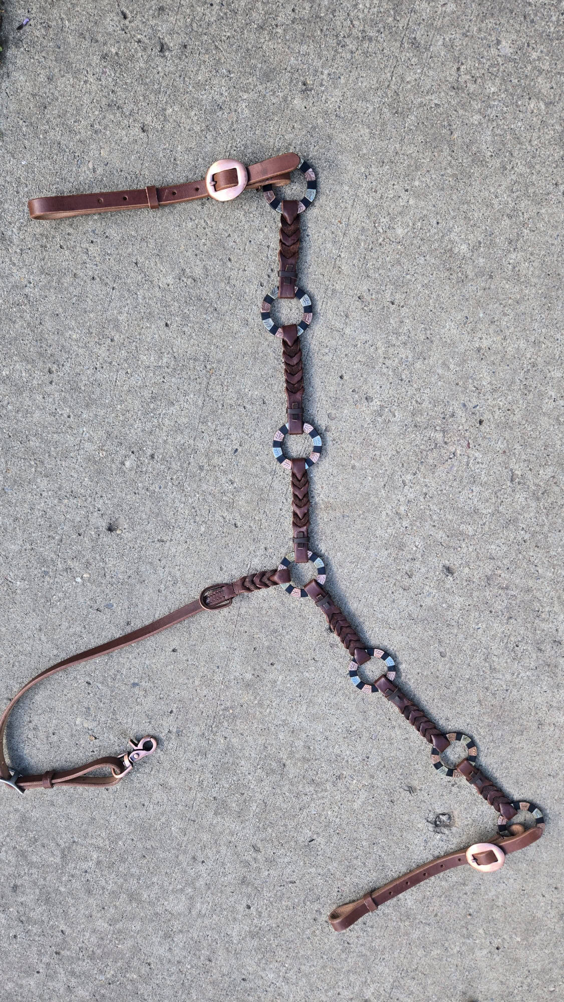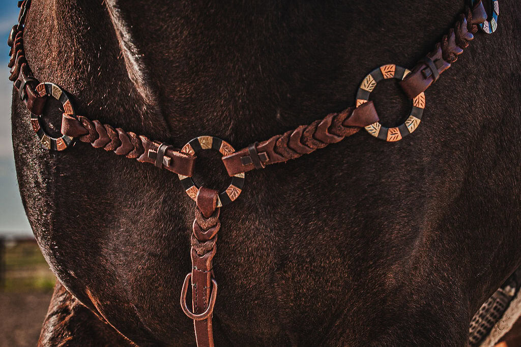 The engraved black metal rings are accented by subtle copper and silver scrollwork—hardware that speaks to high-end western style without losing its working-class grit. Whether you’re showing, roping, or just riding out for the day, the Gold Struck Breast Collar adds durability, balance, and undeniable presence to your tack setup.