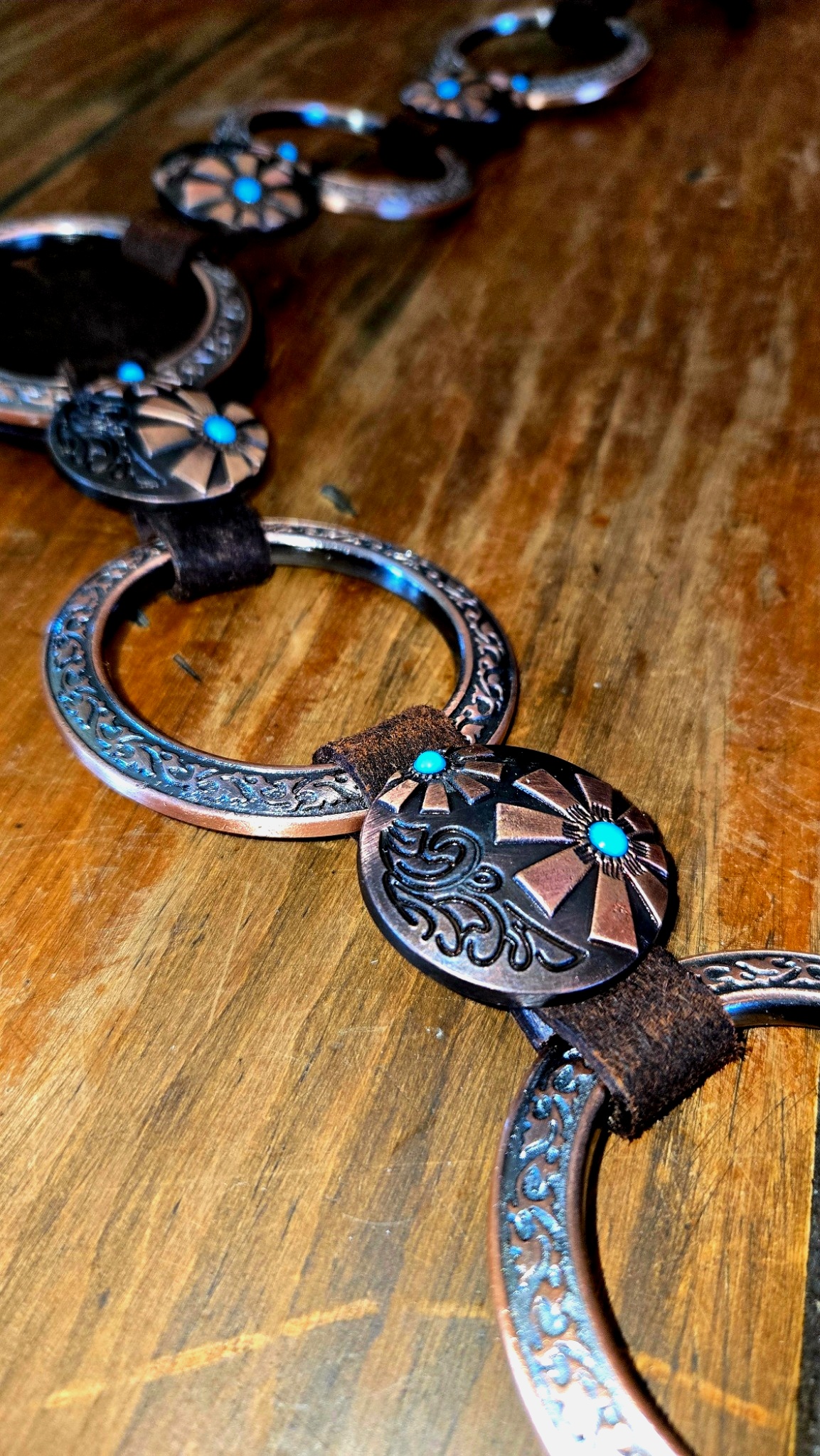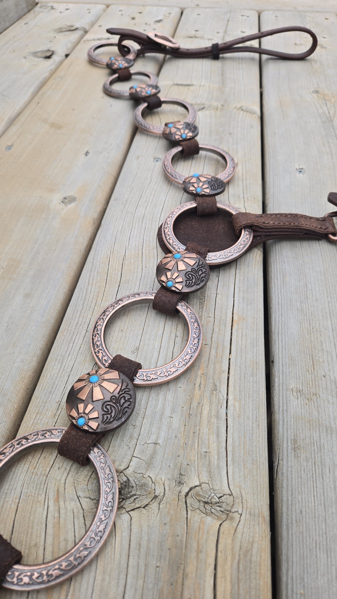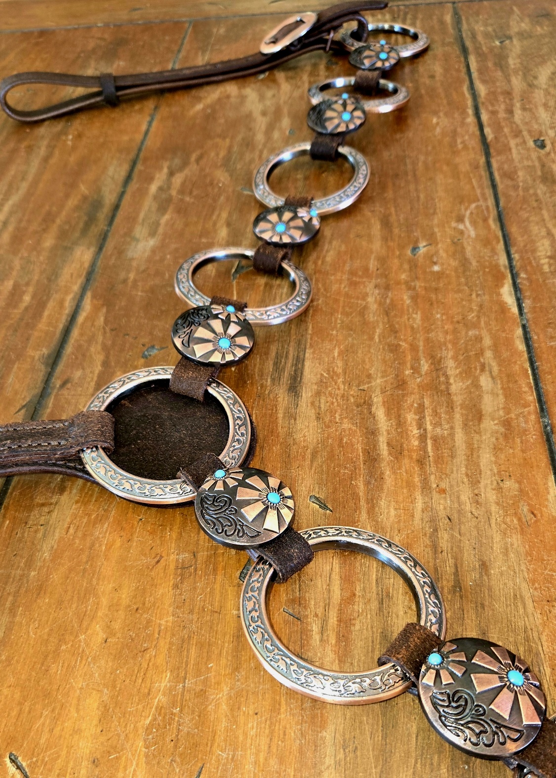 Copper hardware and engraved buckles with turquoise centers bring just enough edge without getting loud. Clean look. No clutter. Nothing extra swinging around.