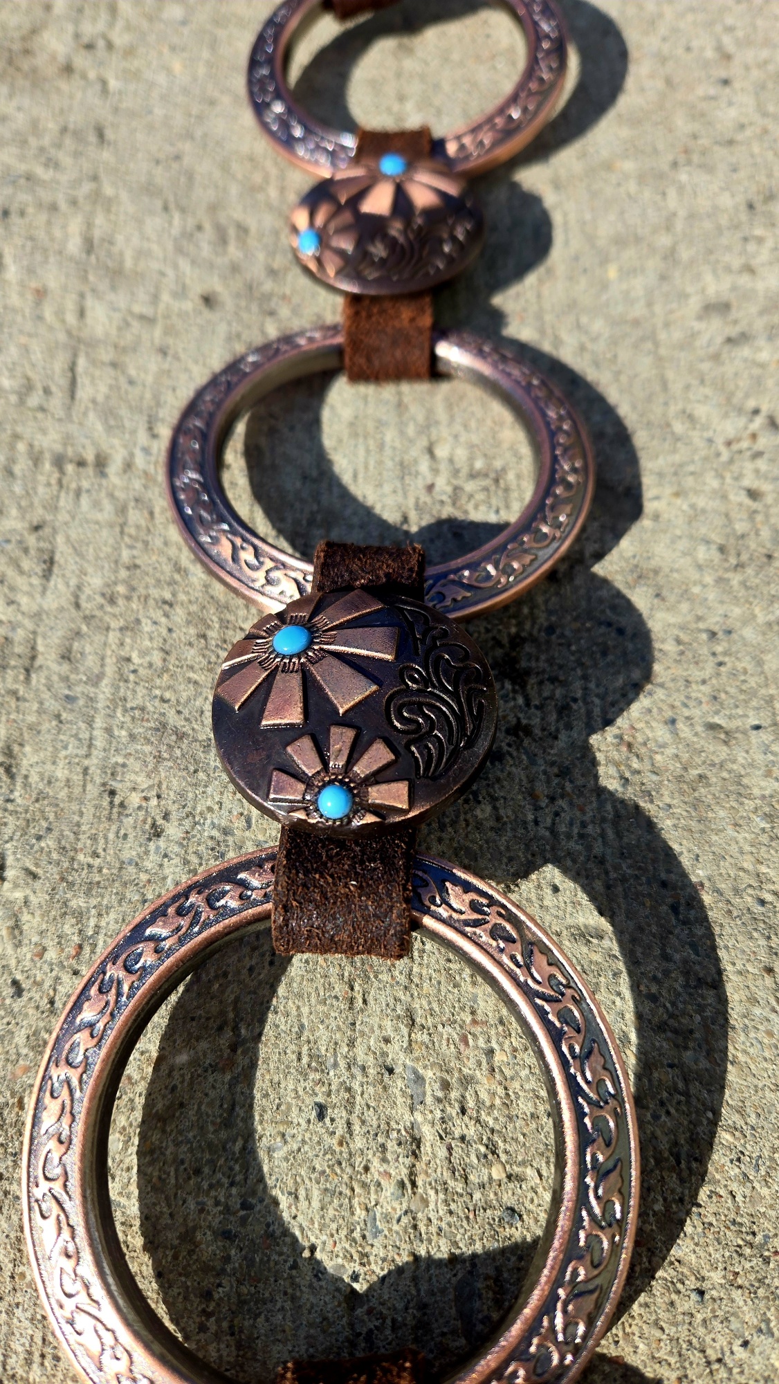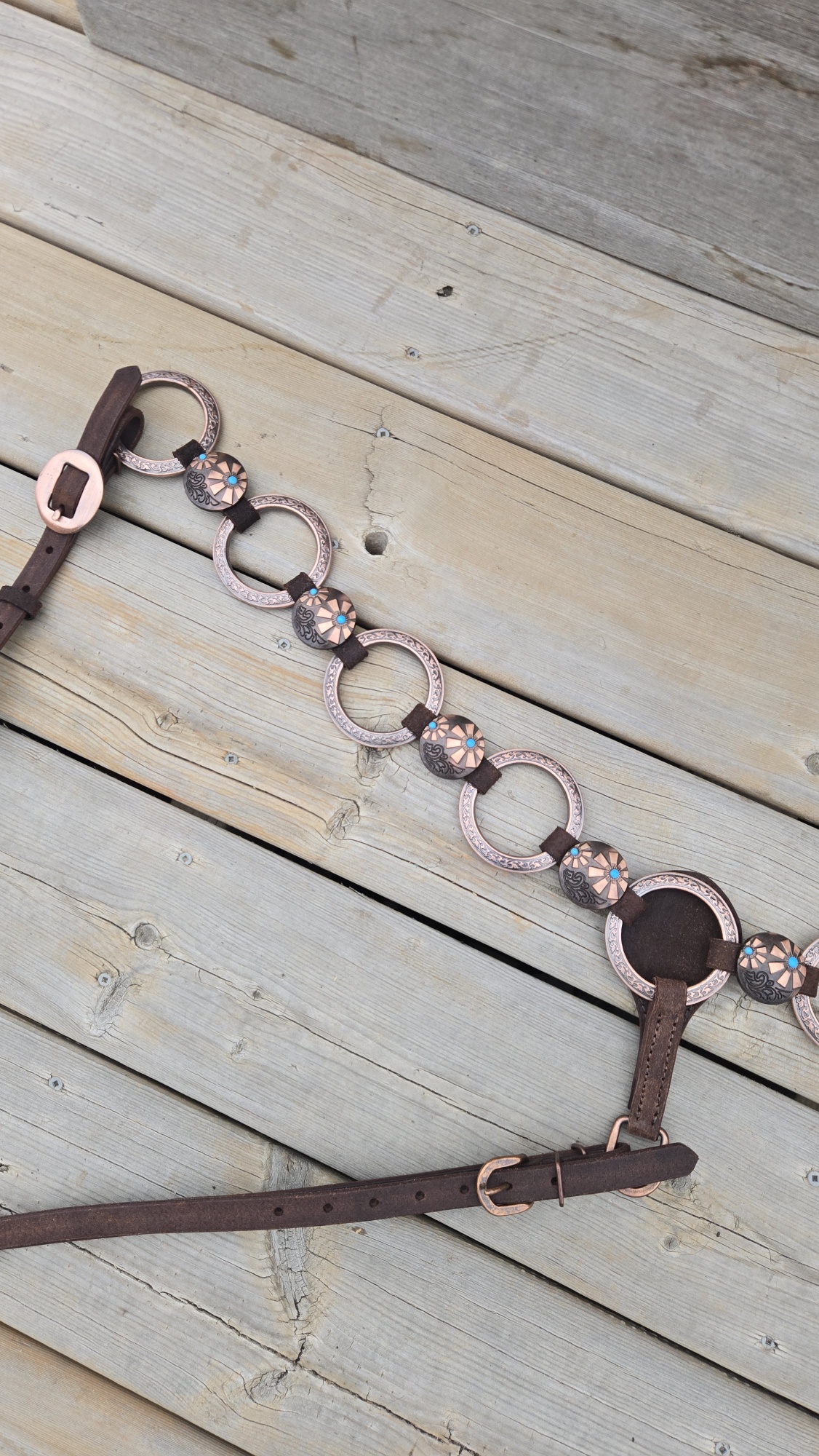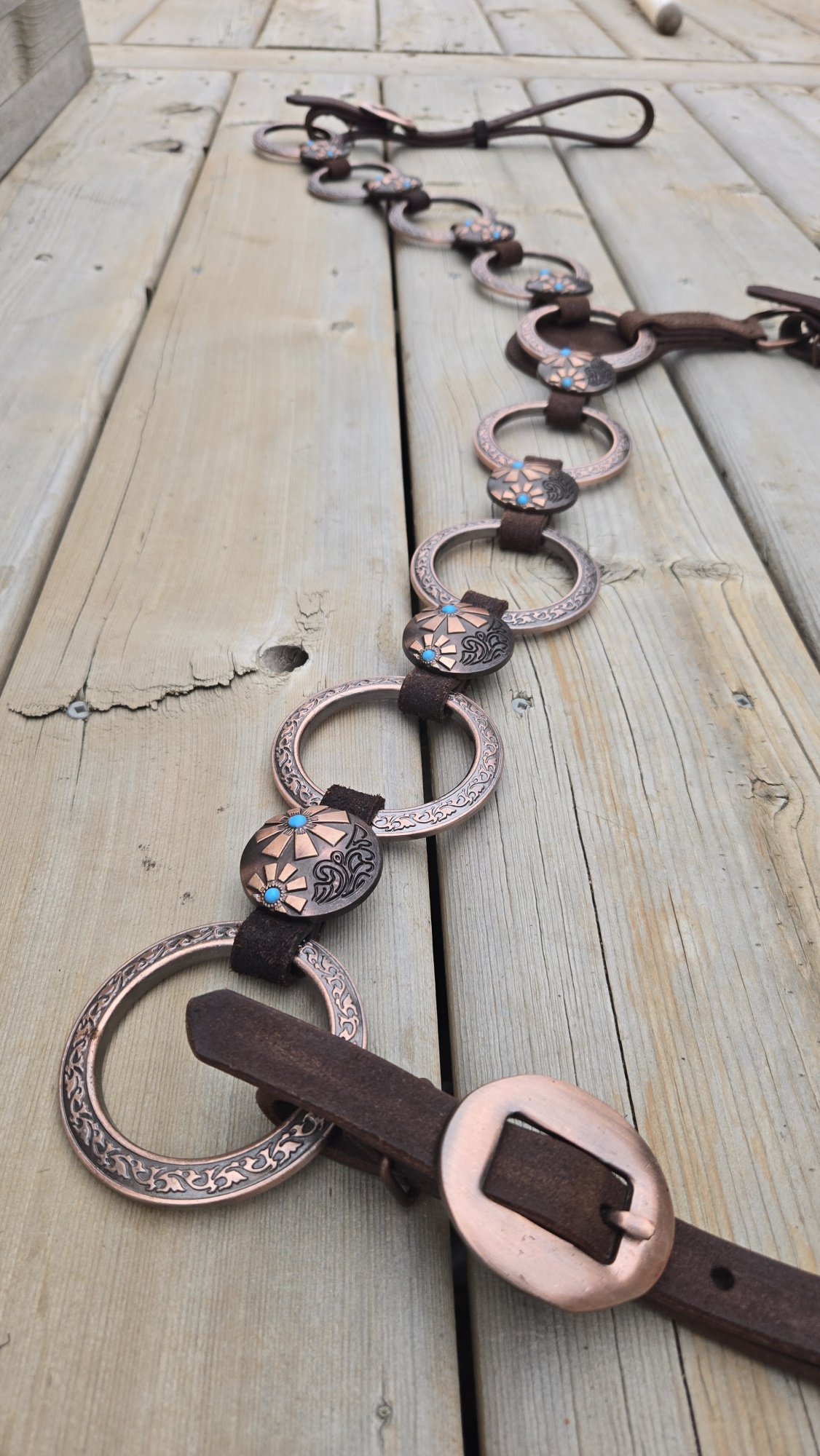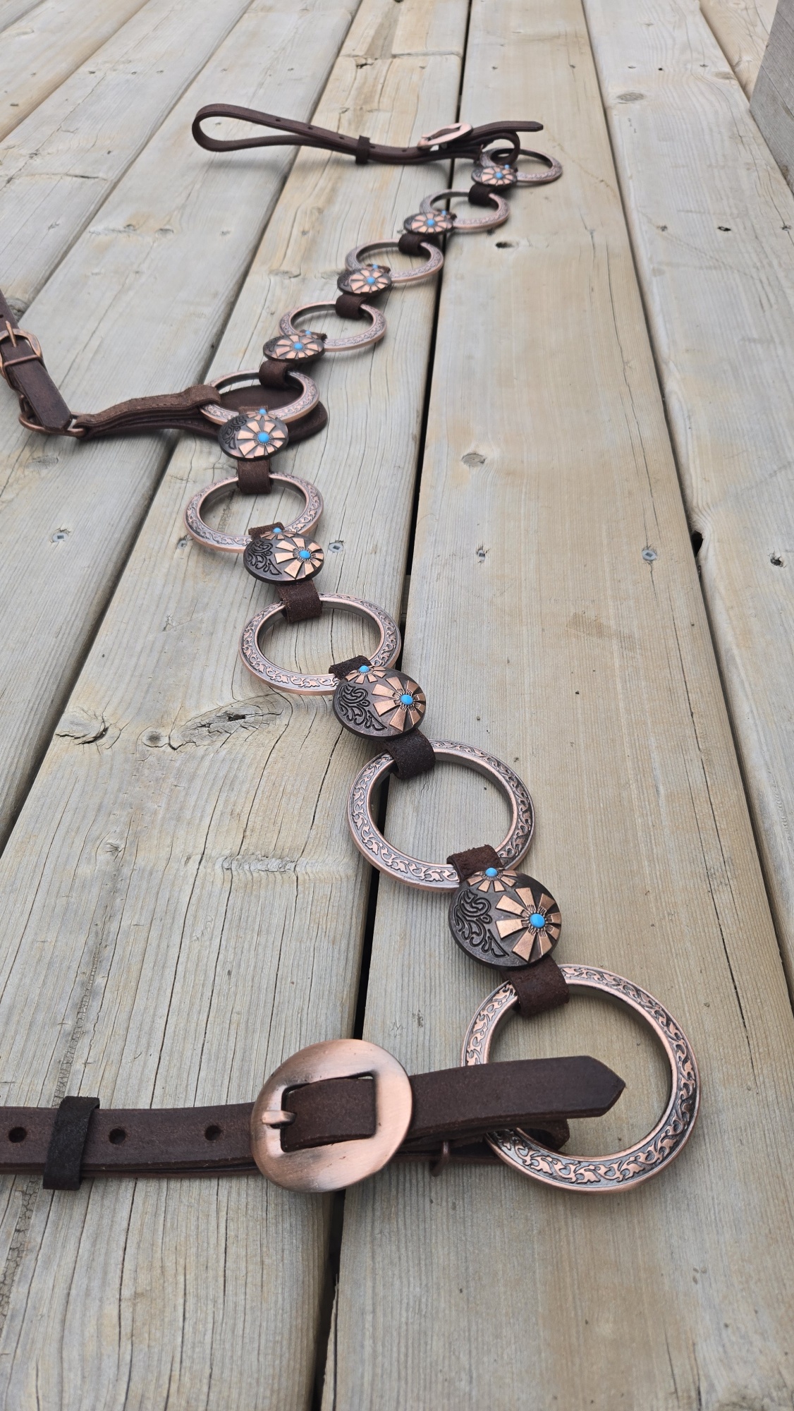 Copper hardware and engraved buckles with turquoise centers bring just enough edge without getting loud. Clean look. No clutter. Nothing extra swinging around.