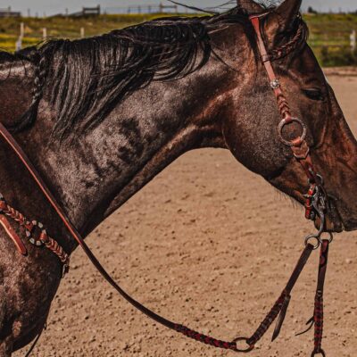 The braided leather browband design provides a clean, secure fit while adding texture and timeless appeal. Each piece is anchored with engraved black metal rings — detailed with copper and silver scrollwork that glints subtly under arena lights or sunlight on the range. The result is a luxury western bridle that looks as good as it rides.