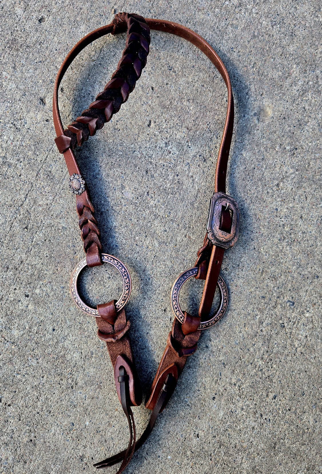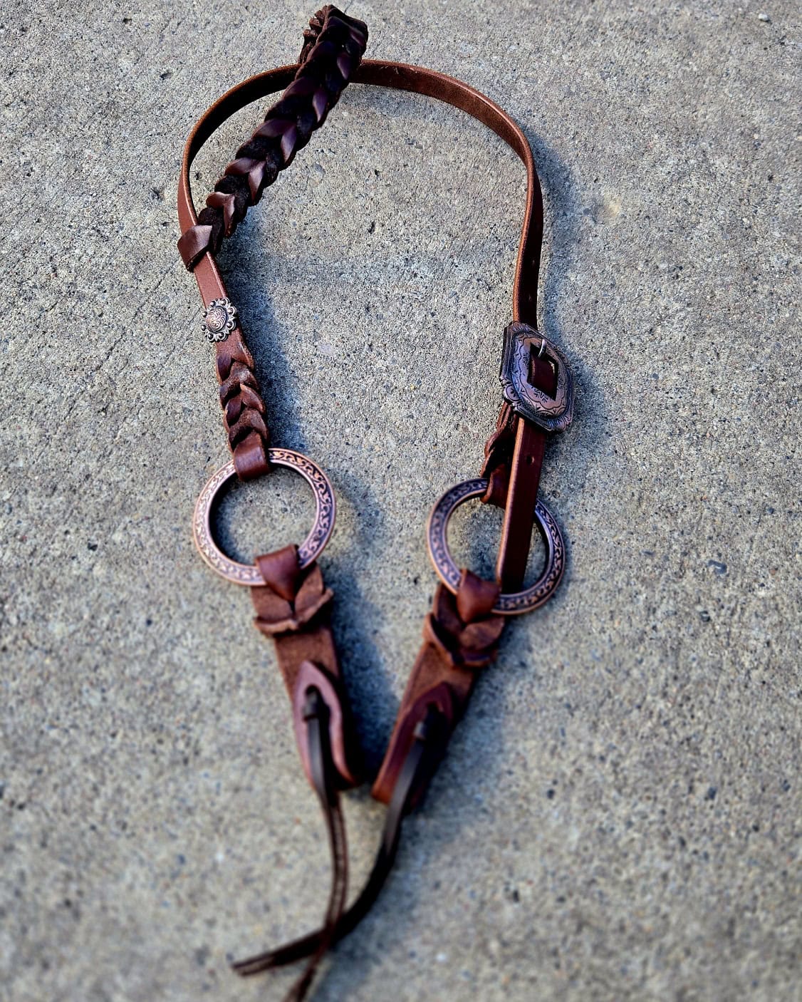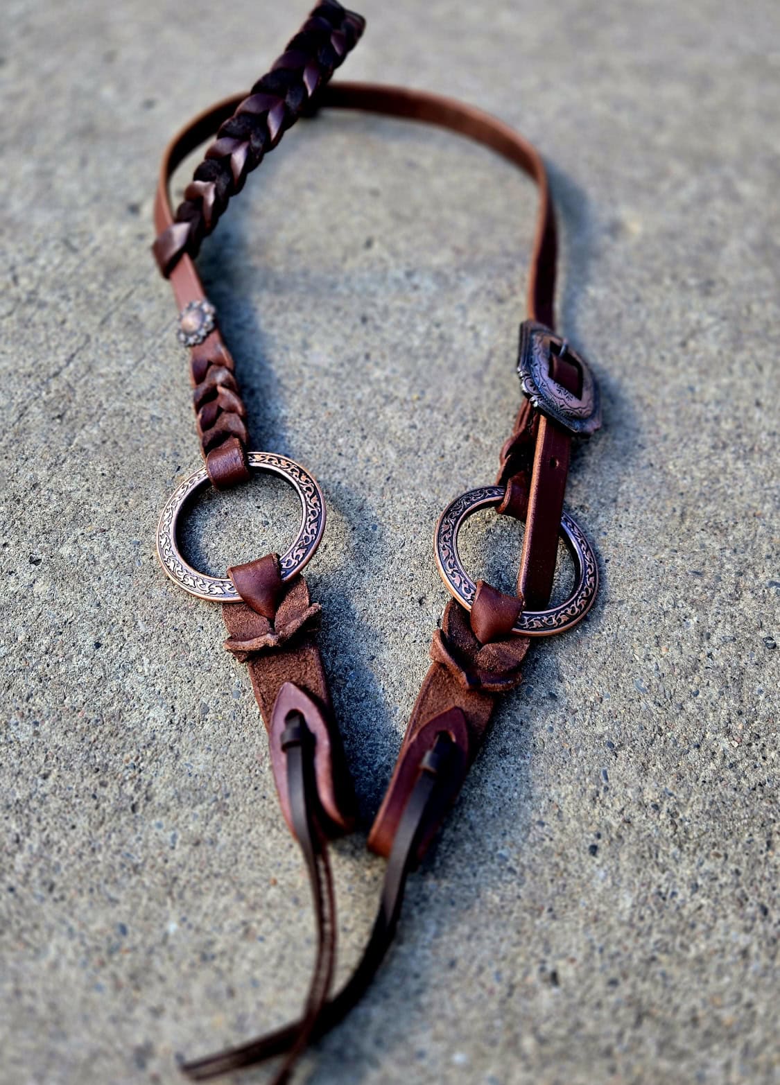 Hand-braided leather with rose gold engraved metal rings and conchos